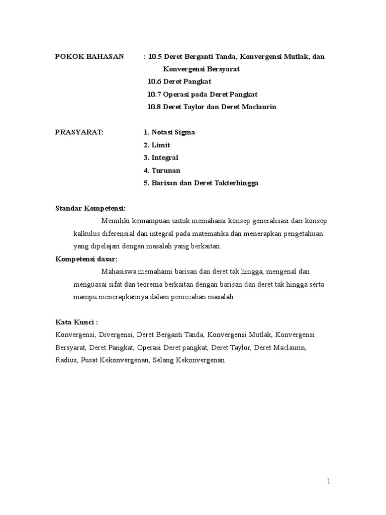 Deret geometri bisa diartikan sebagai jumlah dari n suku pertama pada sebuah barisan geometri ini merupakan contoh deret geomerti tak hingga yaitu deret yang banyak sukunya tak terhingga. Perhatikan bahwa rumus jumlah deret tak hingga konvergen menjadi lebih sederhana karena rn = 0. Deret tak hingga disebut mempunyai jumlahan jika deret tak hingga tersebut konvergen. Berikut ini disajikan soal beserta pembahasan mengenai uji konvergensi deret yang dipelajari dalam mata kuliah analisis real. Bila terdapat bilangan positif r sedemikian sehingga deret kuasa ini konvergen untuk. Kalau belum coba baca dulu di sini. Seperti yang sudah dibahas pada deret geometri, deret geometri tak terhingga konvergen memiliki sebuah rumus untuk menentukan hasil penjumlahan semua suku hingga mendekati nol. Andakan deret harmonik konvergen, tulis jumlahnya sebagai. Oleh karena itu pembahasan pada. 17 bab ii fungsi pembangkit a. = cos menurut pembuktian pada deret maclaurin. Deret kuasa deret tak hingga yang berbentuk 0 n n n x a disebut deret kuasa. Suatu deret yang konvergen ke 1.