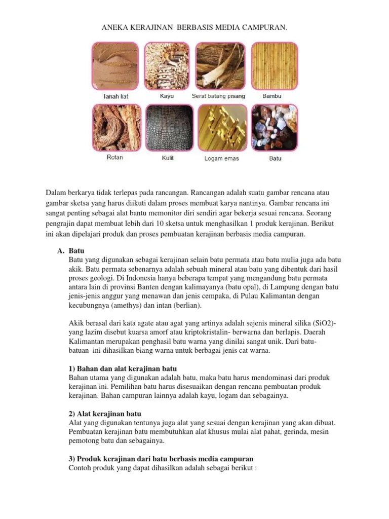 Kerajinan yang dibuat dengan tujuan merubah bentuk sebuah benda . Peta konsep prakarya kelas 9 kurikulum 2013 edisi revisi 2018 untuk materi kerajinan berbasis media campuran tampak pada skema berikut. Berisi catatan mengenai kerajinan berbasis media campuran beserta contoh soal✨. Berikut yang merupakan alasan pengrajin memilih membuat kerajinan berbasis media campuran ditunjukkan oleh nomor ? Kerajinan berbasis media campuran adalah kerajinan yang dibuat dengan tujuan mengubah bentuk sebuah benda yang dominan terbuat dari satu . Soal kerajinan media campuran ix from studylibid.com. Berbasis media campuran, add to my workbooks (2) Batu campuran dapat dilakukan dengan . Mengubah bentuk produk kerajinan berbasis media b. Kerajinan di indonesia menjadi komoditas negara yang dapat meningkatkan …. Contoh soal uraian prakarya kelas 9 kerajinan berbasis media campuran. Kerajinan berbasis media campuran : Searchpengertian.com | pada kesempatan kali ini admin akan membagikan materi seputar kerajinan berbasis media campuran yang meliputi prinsip .