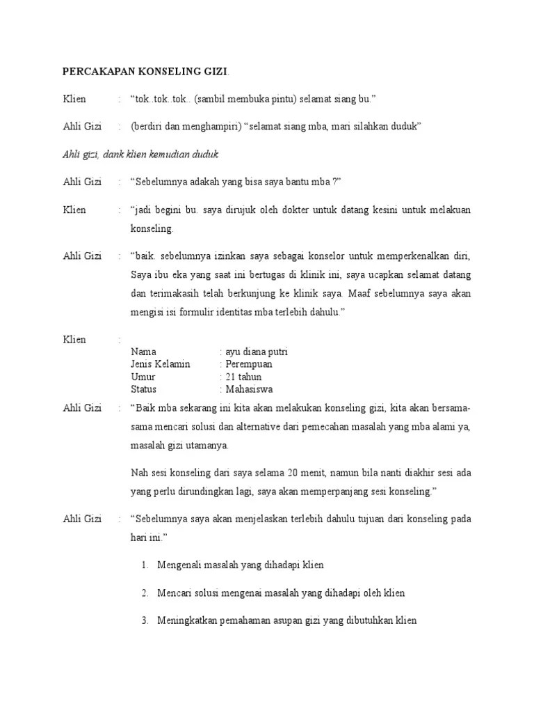 Percakapan Konseling : 3 : Assalamualaikum bidan bidan yanti :. Buatlah scenario (dialog/percakapan) konseling kasus diatas ! Mari bu silahkan masuk mempersilahkan ny. Dialog wawancara konseling individu klien : Download & view contoh percakapan konseling tm i as pdf for free. Wb, permisi bu konselor :